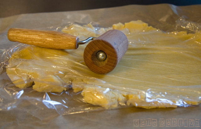 - Wysoką formę (25×35 lub nieco większą) wyłożyć papierem do pieczenia. Równomiernie rozwałkować ciasto (część, która chłodziła się w lodówce). Podczas wałkowania warto skorzystać z folii, dzięki temu ciasto nie będzie przyklejało się do wałka. Rozwałkowany spód ponakłuwać widelcem.
