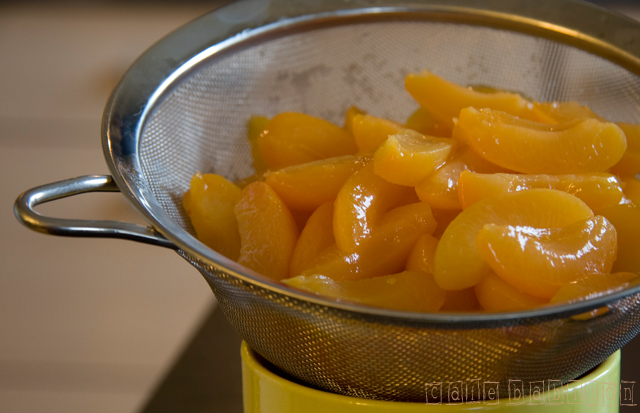 - Brzoskwinie lub morele odsączyć dokładnie na sicie. Pokroić w mniejsze kawałki.
