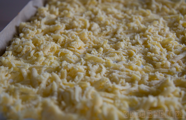 - Część ciasta, która chłodziła się w zamrażarce, zetrzeć na tarce na dużych oczkach równomiernie rozkładając na pianie.